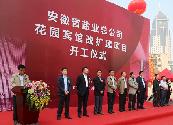 2014年10月18日上午,安徽省花園賓館改擴建項目在花園賓館舉行隆重的開工奠基儀式,參加儀式的嘉賓有:中共廬陽區(qū)委書記吳勁、副書記張家祥,廬陽區(qū)副區(qū)長李仲生、中建八局四公司董事長周可璋及相關協(xié)作單位、省鹽業(yè)總公司總經(jīng)理詹先豪,副總經(jīng)理王良貴、顏宗華、楊曉彬,省公司本部機關處室及直屬公司主要負責人。